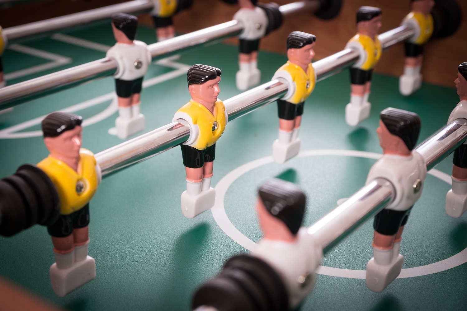 Die Spielfläche besteht aus ca. 13 mm starkem MDF ohne Einsätze (mit hochgezogenen Ecken). 16mm verchromte Vollmassiv-Stangen auf welchen die 22 Spieler (schraubbar) montiert sind. Im Lieferumfang sind pro Mannschaft je 2 Ersatzspieler enthalten. Die Griffe sind hochwertige Turniergriffe und die Stangen sind in Kugellagern geführt.