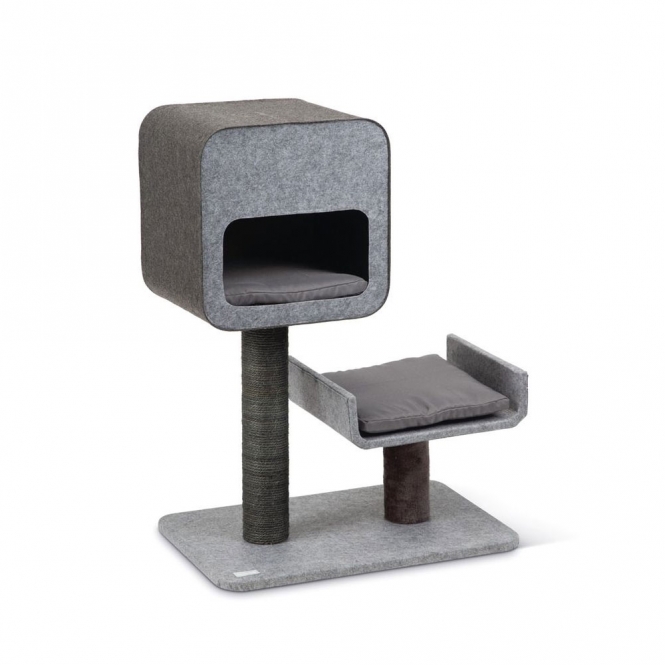 Dank der Materialwahl und der puristischen Farbgebung in Grautönen ist der Kratzbaum ein zeitlos schönes Möbel, das sich vielen Einrichtungsstilen anpasst. Vom Liegeplatz aus kann die Katze alles im Auge behalten, dort lässt sich aber auch gut ein kleines Nickerchen halten. Und natürlich lädt besonders das Katzenhaus nach einer ausgiebigen Kratzsession zum entspannten Verweilen ein.